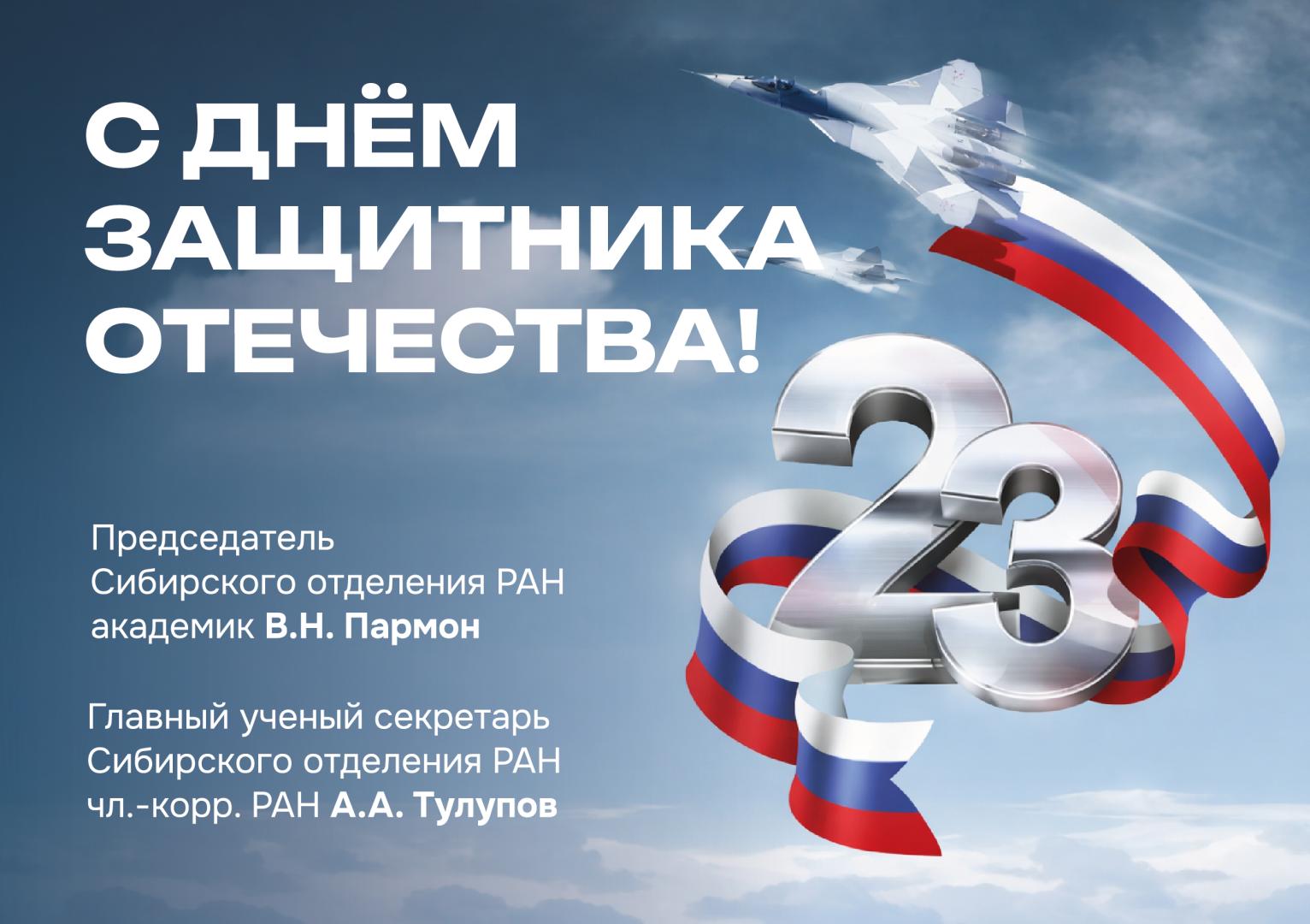 Поздравление Председателя Сибирского отделения РАН ак. РАН Валентина Николаевича Пармона и Главного ученого секретаря Сибирского отделения РАН чл.-корр. РАН Андрея Александровича Тулупова с Днём защитника Отечества